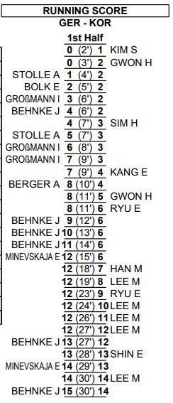 한국은 전반 초반 독일의 공격에 연속 실점을 하며 3-7. 6-12까지 뒤지며 어려운 경기를 펼쳤습니다.
