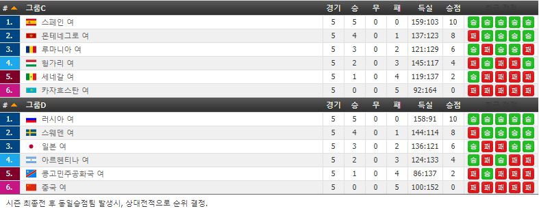 옆 그룹에서는 C조 스페인 몬테네그로 루마니아 , D조 러시아 스웨덴 일본이 메인 라운드 진출했습니다.