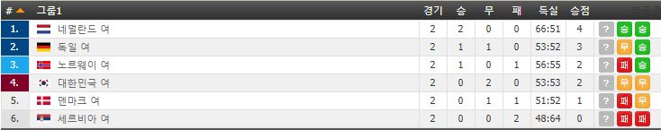 덴마크 : 한국 무 , 독일 패 , 1무 1패 승점 1