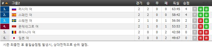 러시아 스페인 2승으로 시작 , 스웨덴 몬테네그로 1승 1패, 루마니아 일본 2패입니다.