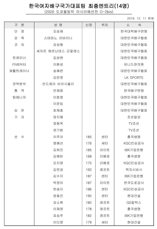 | 2020 도쿄올림픽 여자배구 올림픽예선 일정, 여자배구 한국 인도네시아 중계, 도쿄올림픽 여자배구 국가대표명단 (0) | 2020.01.07 |
