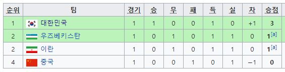 이란 우즈벡이 비기면서 1무로 2위 , 중국이 최하위입니다.