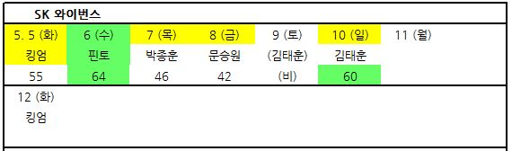 | 2020 KBO 리그 SK 와이번스 선발 로테이션 (2020.05.10 현재) (0) | 2020.05.11 |