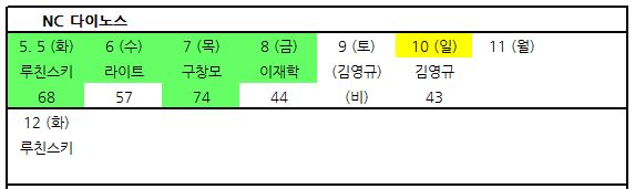 2020 KBO 리그 NC 다이노스 선발 로테이션 (2020.05.10 현재)