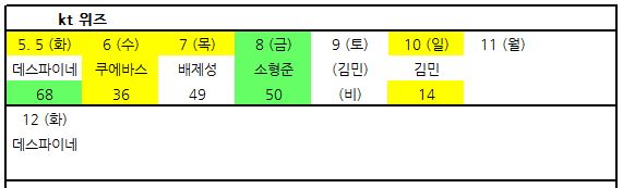 | 2020 KBO 리그 kt 위즈 선발 로테이션 (2020.05.10 현재) (0) | 2020.05.11 |