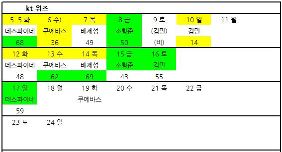 상대팀 : 주중 원정 kt , 주말 원정 NC