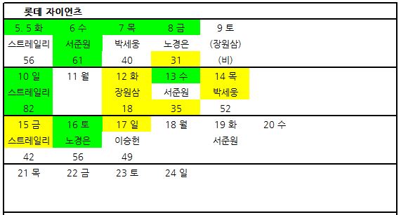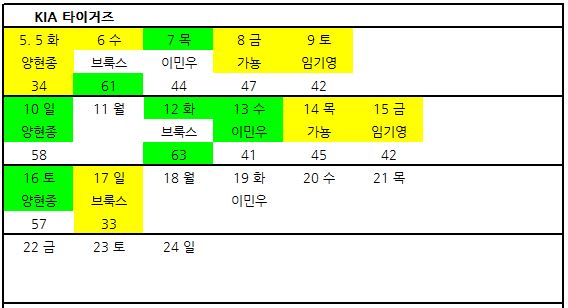 날짜의 연두색은 팀 승리, 노란색은 팀 패배를 의미하고