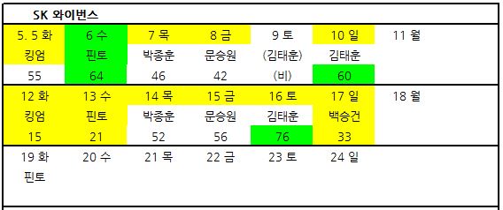 SK 주말 3연전은 김태훈 미정 핀토로 예상됩니다.