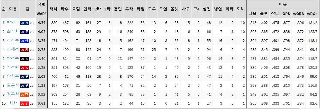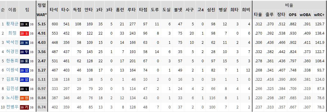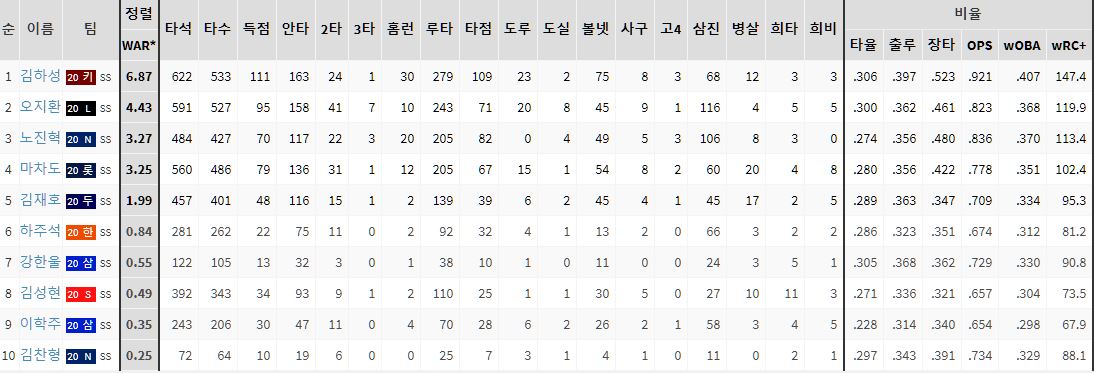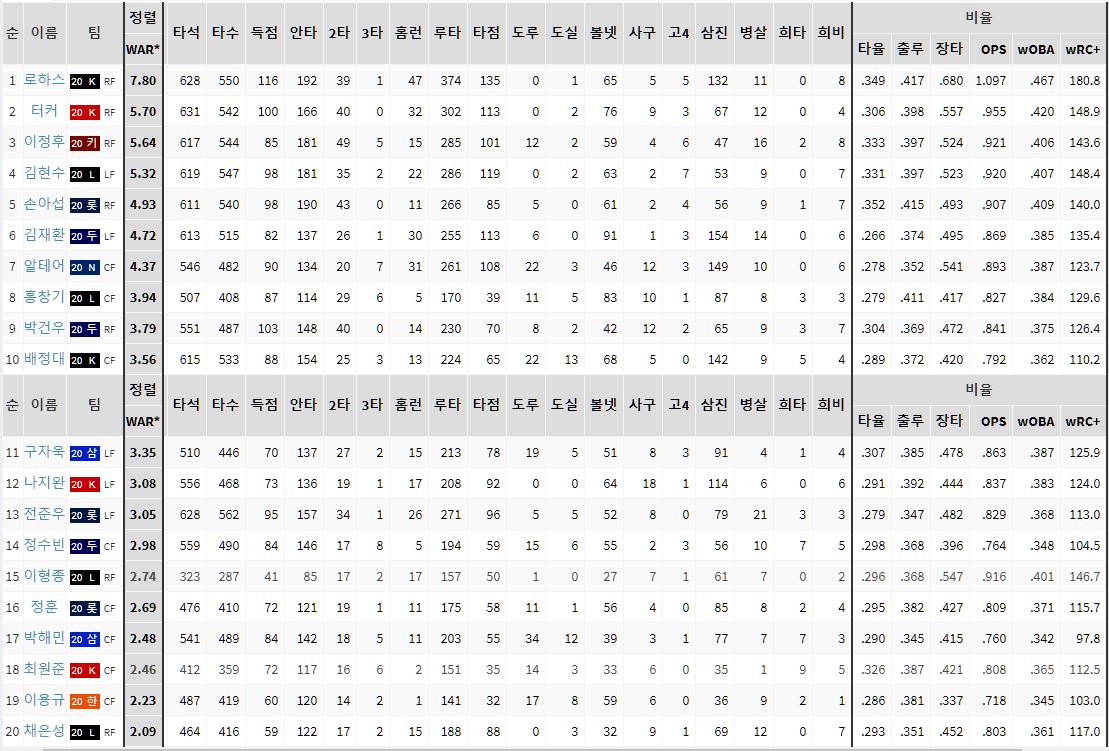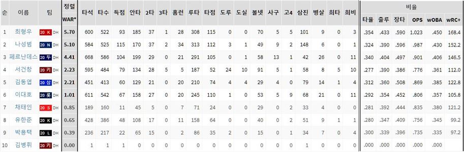 스탯티즈 WAR 기준 1위가 모두 수상.