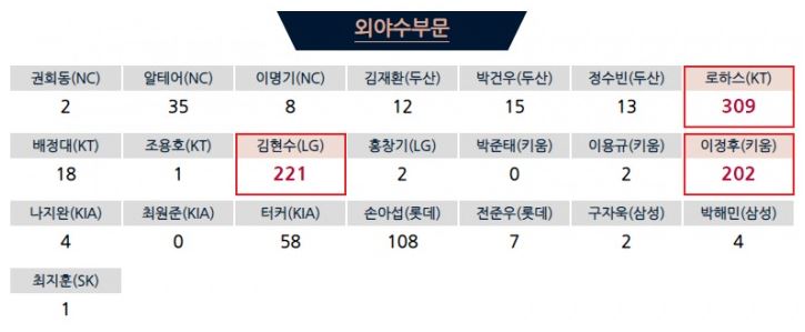 2020 KBO 골든글러브 수상자, 득표율, 포지션별 성적 비교