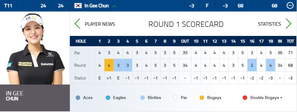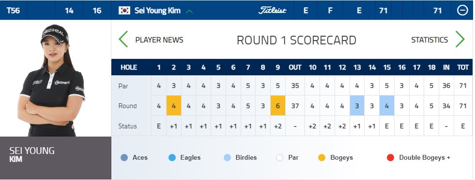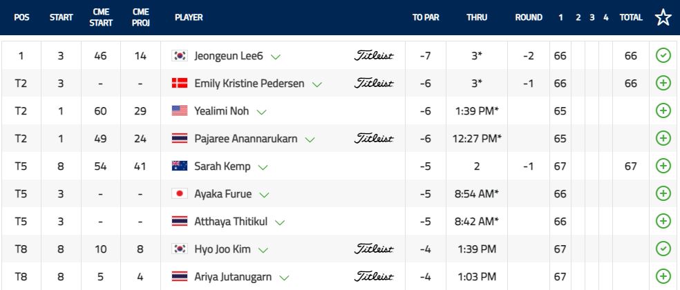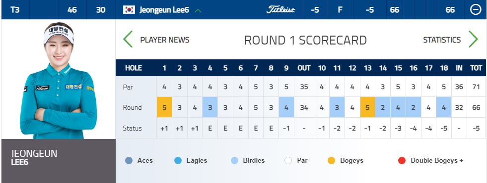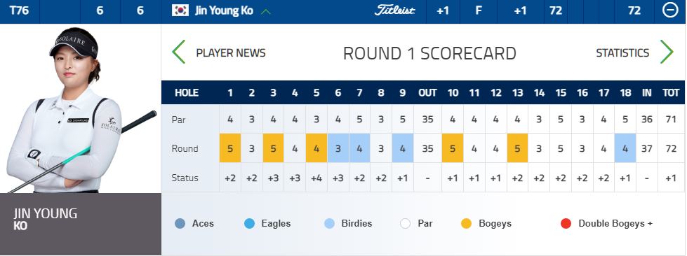 LPGA 아문디 에비앙 챔피언십 1라운드 순위, 이정은6 3위, 김효주 7위, 전인지 11위, 박인비 김세영 54위, 박성현 97위