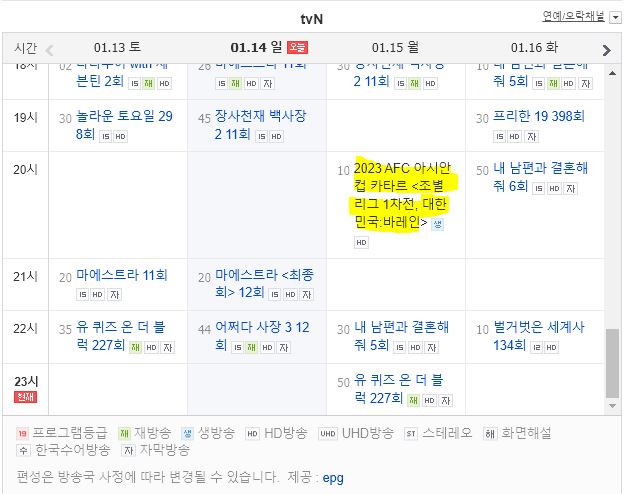 한국 경기는 tvn에서 중계 할것으로 보입니다.
