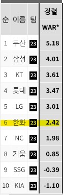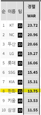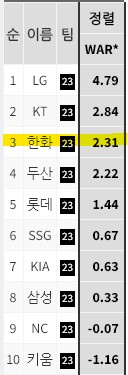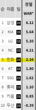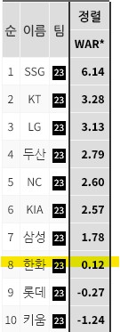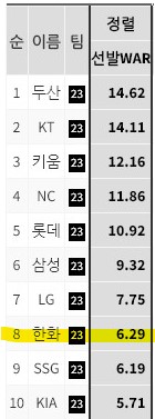 2023시즌 한화의 투수 WAR , 선발 WAR 모두 8위를 기록했다.