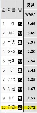 한화 2루수 WAR 0.84로 되어 있지만
