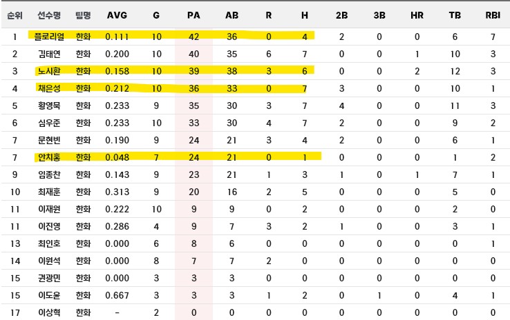 하지만 한화는 이 선수들만 부진한건 아니다.